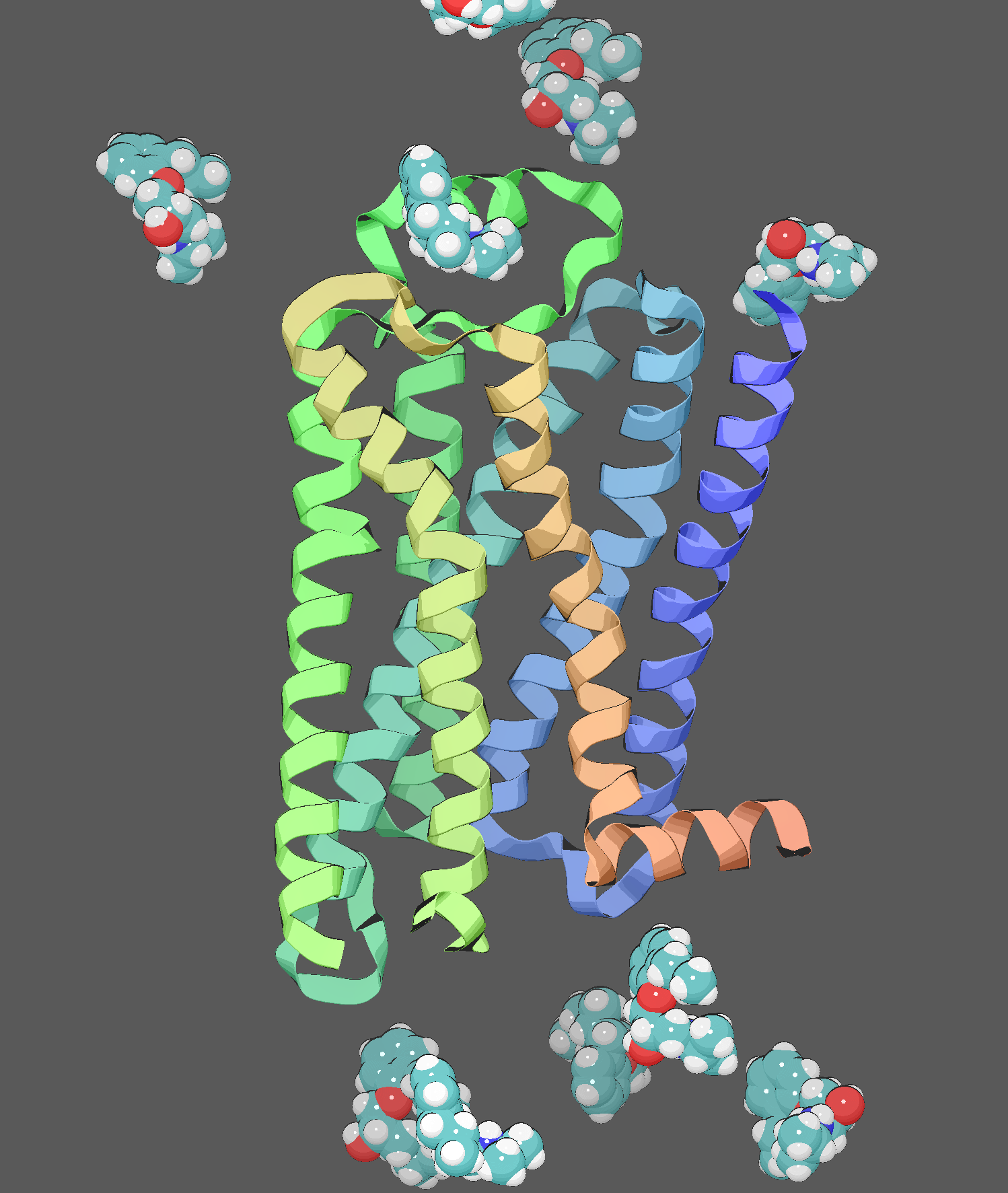 The ribbons representation can also look really good when you need less detail on the protein. Here’s the same receptor with several dihydroalprenolols shown in VDW.